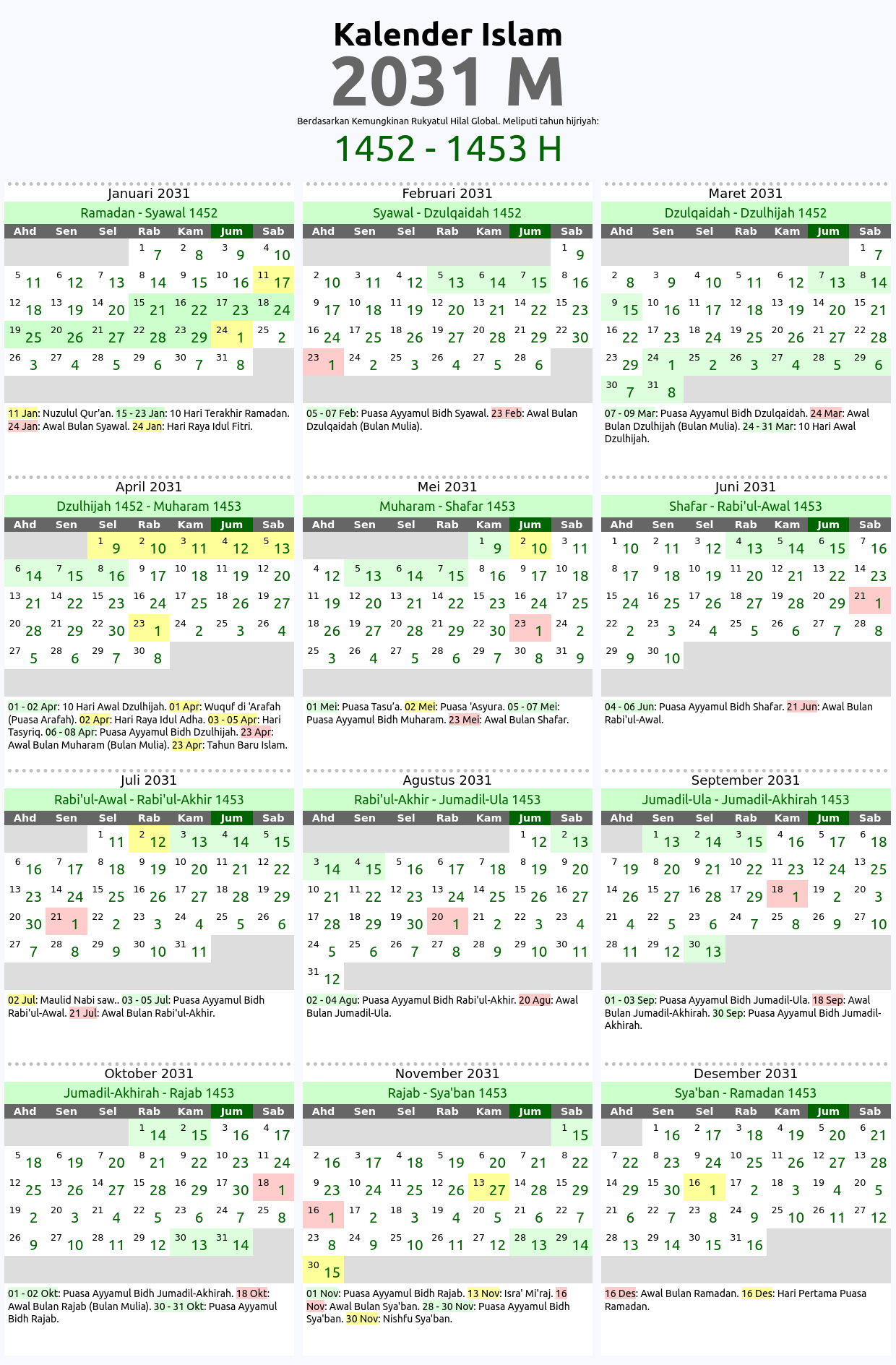 Kalender islam global tahun 2031 M ini berdasarkan kaidah imkan rukyat global di mana awal bulan hijriyah dihitung berdasarkan penampakan hilal di daratan mana saja di dunia ini. Kalender hijriyah 2031 M ini meliputi tahun islam: 1452, 1453 H. Tabel penanggalan atau tarikh islam yg ditampilkan ditandai dengan beberapa kode warna sesuai dengan jenis tanggalnya seperti: awal bulan hijriyah 2031 M, hari-hari besar umat islam 2031 M, serta tanggal puasa sunnah dan wajib tahun 2031 M.