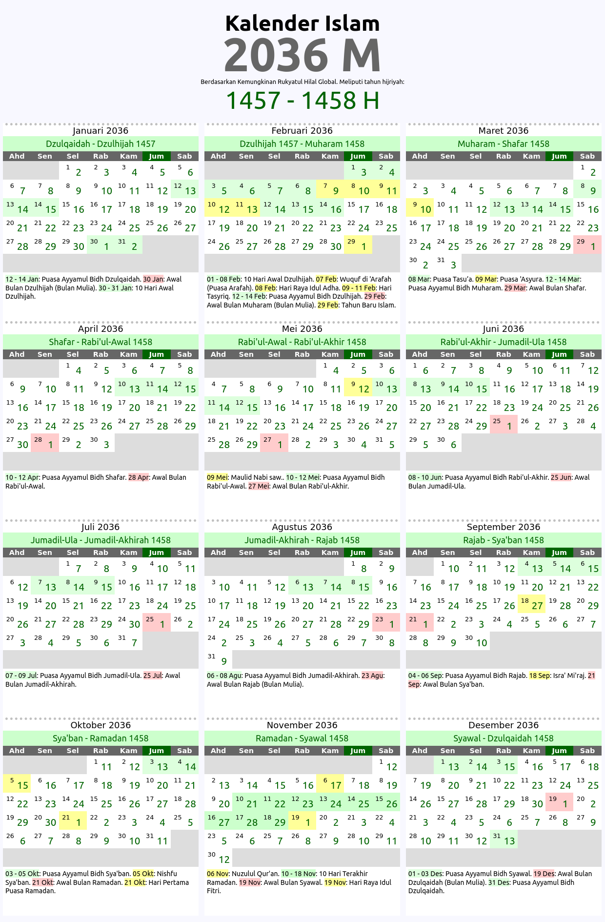 Kalender islam global tahun 2036 M ini berdasarkan kaidah imkan rukyat global di mana awal bulan hijriyah dihitung berdasarkan penampakan hilal di daratan mana saja di dunia ini. Kalender hijriyah 2036 M ini meliputi tahun islam: 1457, 1458 H. Tabel penanggalan atau tarikh islam yg ditampilkan ditandai dengan beberapa kode warna sesuai dengan jenis tanggalnya seperti: awal bulan hijriyah 2036 M, hari-hari besar umat islam 2036 M, serta tanggal puasa sunnah dan wajib tahun 2036 M.