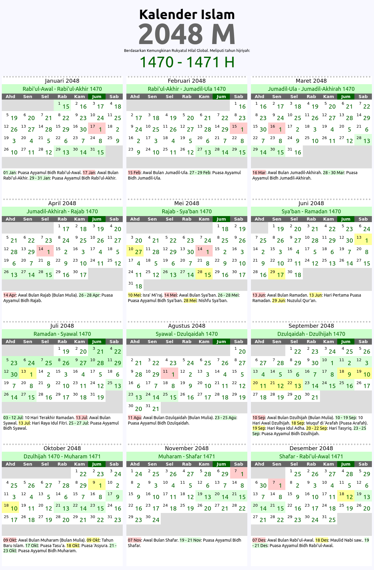Kalender islam global tahun 2048 M ini berdasarkan kaidah imkan rukyat global di mana awal bulan hijriyah dihitung berdasarkan penampakan hilal di daratan mana saja di dunia ini. Kalender hijriyah 2048 M ini meliputi tahun islam: 1470, 1471 H. Tabel penanggalan atau tarikh islam yg ditampilkan ditandai dengan beberapa kode warna sesuai dengan jenis tanggalnya seperti: awal bulan hijriyah 2048 M, hari-hari besar umat islam 2048 M, serta tanggal puasa sunnah dan wajib tahun 2048 M.