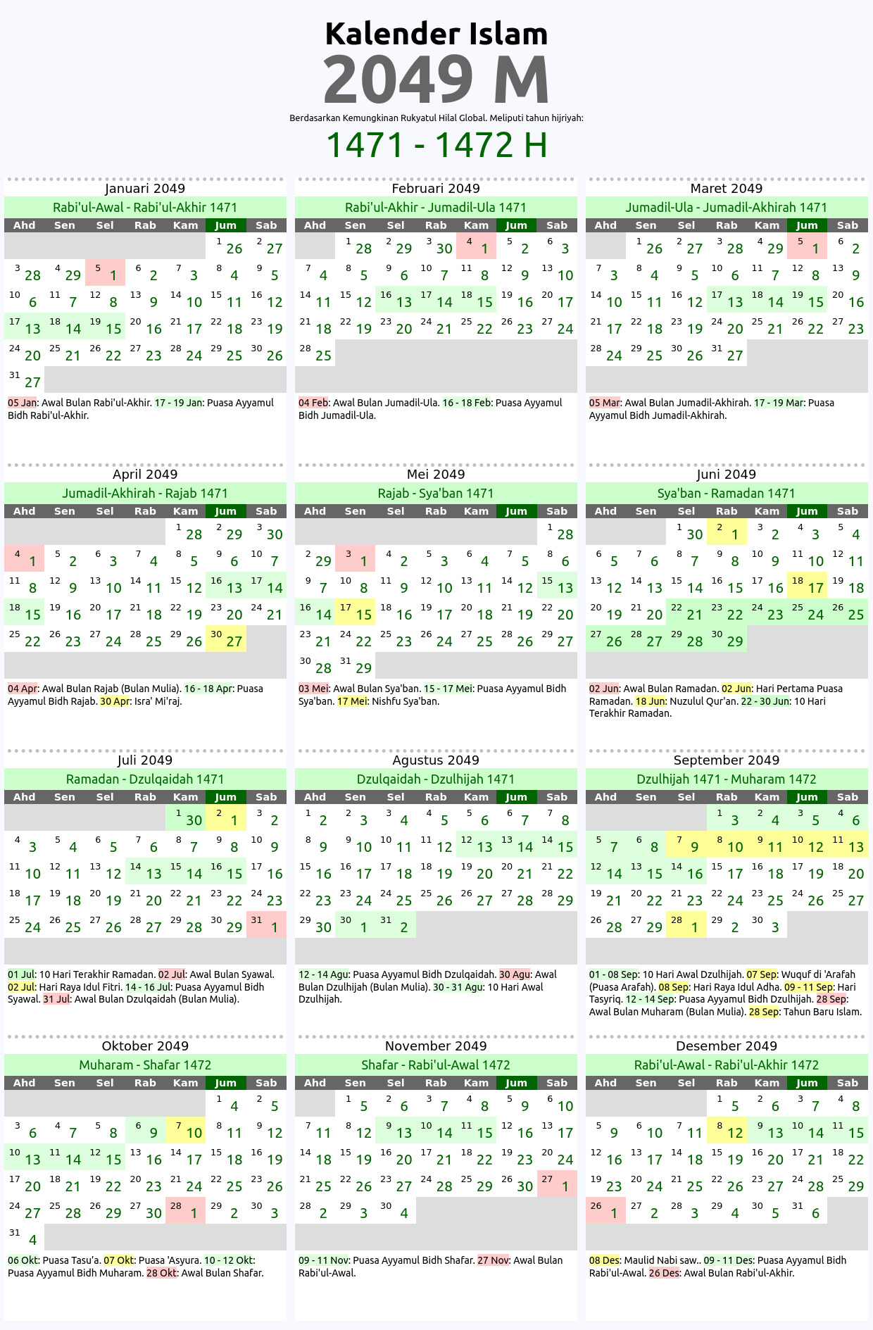 | 27 November 2049 | Awal Bulan Rabi'ul-Awal 1472 H | 1 Rabi'ul-Awal 1472 H | Sabtu |