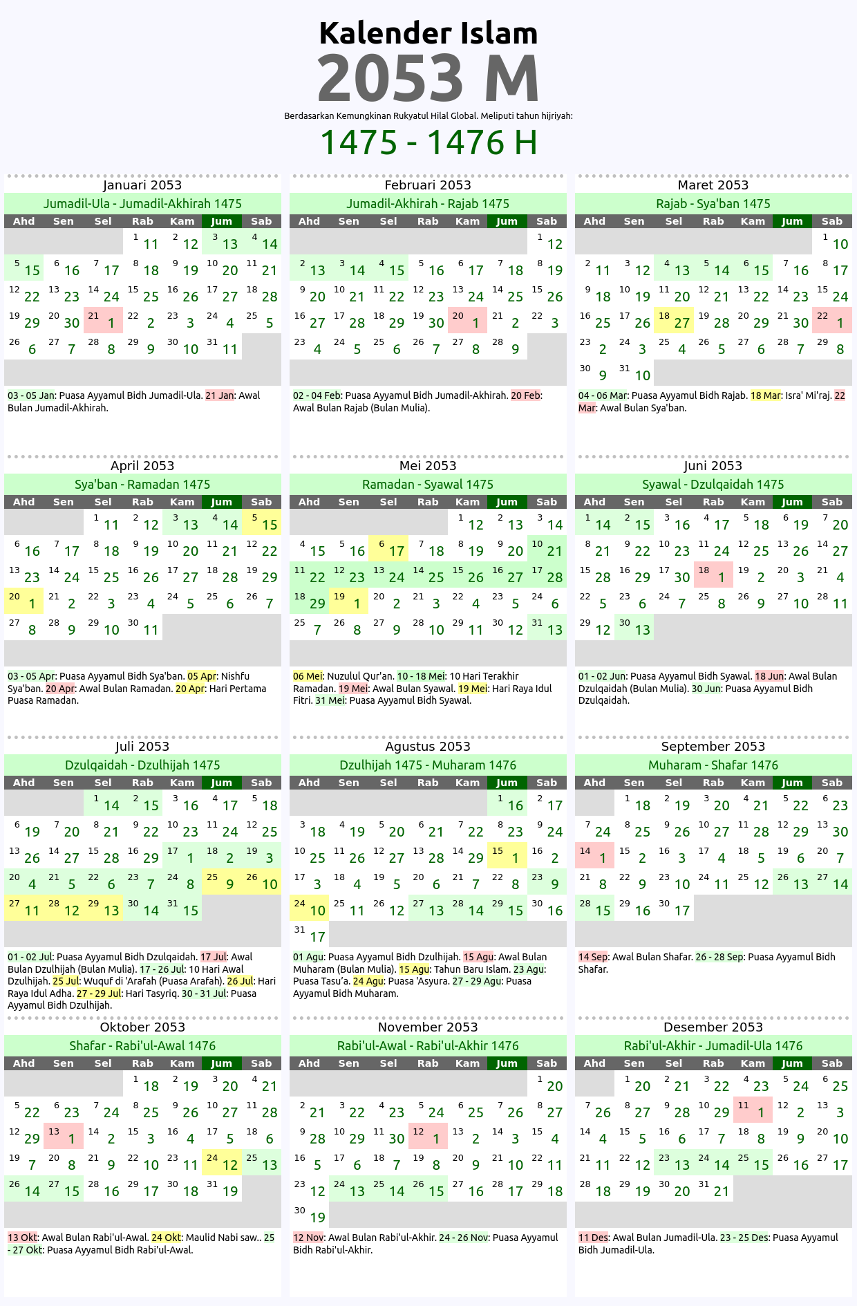 Kalender islam global tahun 2053 M ini berdasarkan kaidah imkan rukyat global di mana awal bulan hijriyah dihitung berdasarkan penampakan hilal di daratan mana saja di dunia ini. Kalender hijriyah 2053 M ini meliputi tahun islam: 1475, 1476 H. Tabel penanggalan atau tarikh islam yg ditampilkan ditandai dengan beberapa kode warna sesuai dengan jenis tanggalnya seperti: awal bulan hijriyah 2053 M, hari-hari besar umat islam 2053 M, serta tanggal puasa sunnah dan wajib tahun 2053 M.