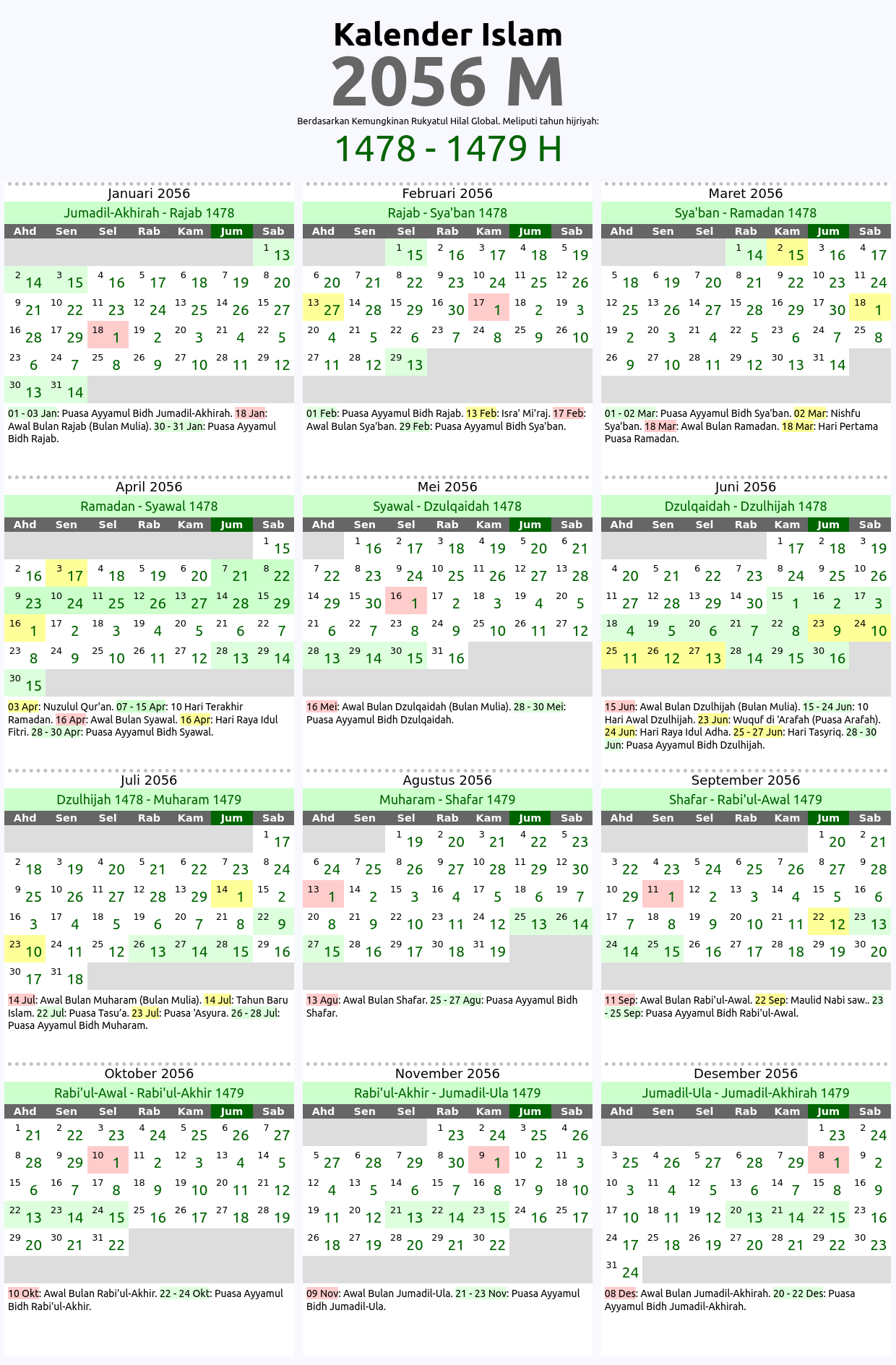 Kalender islam global tahun 2056 M ini berdasarkan kaidah imkan rukyat global di mana awal bulan hijriyah dihitung berdasarkan penampakan hilal di daratan mana saja di dunia ini. Kalender hijriyah 2056 M ini meliputi tahun islam: 1478, 1479 H. Tabel penanggalan atau tarikh islam yg ditampilkan ditandai dengan beberapa kode warna sesuai dengan jenis tanggalnya seperti: awal bulan hijriyah 2056 M, hari-hari besar umat islam 2056 M, serta tanggal puasa sunnah dan wajib tahun 2056 M.