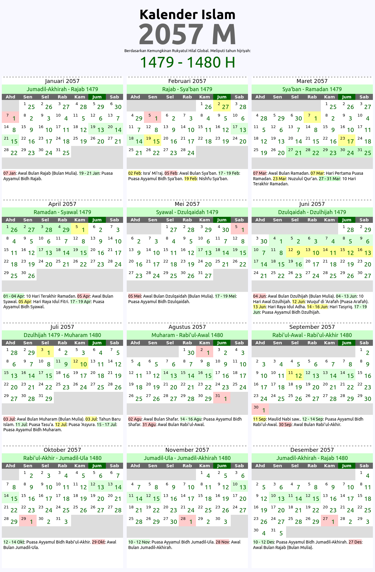 Kalender islam global tahun 2057 M ini berdasarkan kaidah imkan rukyat global di mana awal bulan hijriyah dihitung berdasarkan penampakan hilal di daratan mana saja di dunia ini. Kalender hijriyah 2057 M ini meliputi tahun islam: 1479, 1480 H. Tabel penanggalan atau tarikh islam yg ditampilkan ditandai dengan beberapa kode warna sesuai dengan jenis tanggalnya seperti: awal bulan hijriyah 2057 M, hari-hari besar umat islam 2057 M, serta tanggal puasa sunnah dan wajib tahun 2057 M.