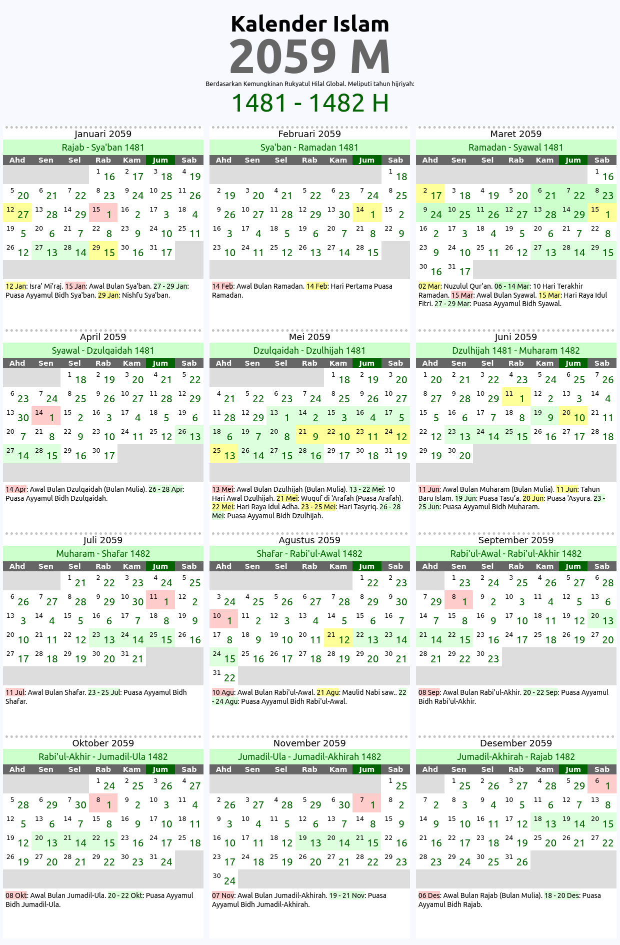 Kalender islam global tahun 2059 M ini berdasarkan kaidah imkan rukyat global di mana awal bulan hijriyah dihitung berdasarkan penampakan hilal di daratan mana saja di dunia ini. Kalender hijriyah 2059 M ini meliputi tahun islam: 1481, 1482 H. Tabel penanggalan atau tarikh islam yg ditampilkan ditandai dengan beberapa kode warna sesuai dengan jenis tanggalnya seperti: awal bulan hijriyah 2059 M, hari-hari besar umat islam 2059 M, serta tanggal puasa sunnah dan wajib tahun 2059 M.