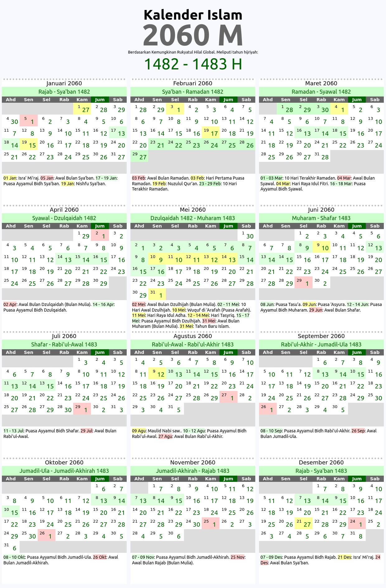 Kalender islam global tahun 2060 M ini berdasarkan kaidah imkan rukyat global di mana awal bulan hijriyah dihitung berdasarkan penampakan hilal di daratan mana saja di dunia ini. Kalender hijriyah 2060 M ini meliputi tahun islam: 1482, 1483 H. Tabel penanggalan atau tarikh islam yg ditampilkan ditandai dengan beberapa kode warna sesuai dengan jenis tanggalnya seperti: awal bulan hijriyah 2060 M, hari-hari besar umat islam 2060 M, serta tanggal puasa sunnah dan wajib tahun 2060 M.