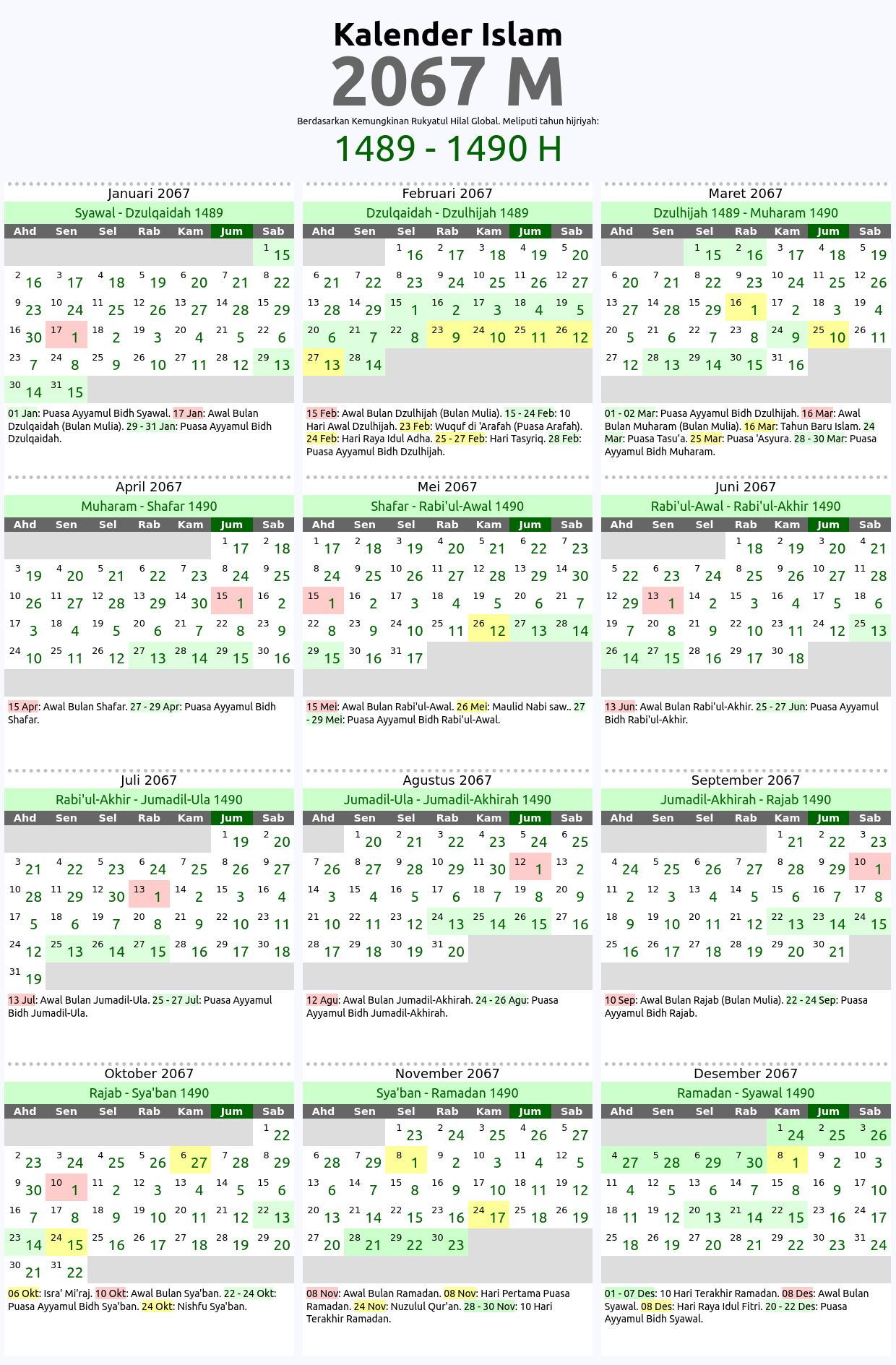 Kalender islam global tahun 2067 M ini berdasarkan kaidah imkan rukyat global di mana awal bulan hijriyah dihitung berdasarkan penampakan hilal di daratan mana saja di dunia ini. Kalender hijriyah 2067 M ini meliputi tahun islam: 1489, 1490 H. Tabel penanggalan atau tarikh islam yg ditampilkan ditandai dengan beberapa kode warna sesuai dengan jenis tanggalnya seperti: awal bulan hijriyah 2067 M, hari-hari besar umat islam 2067 M, serta tanggal puasa sunnah dan wajib tahun 2067 M.