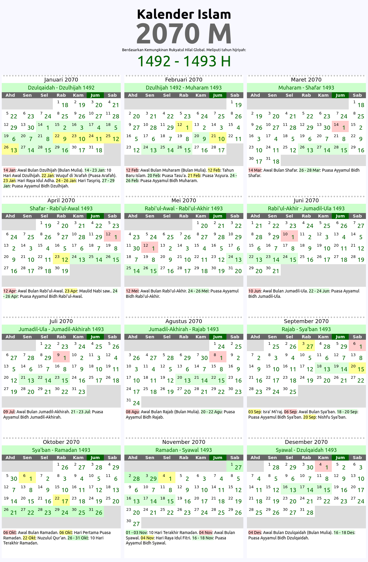 Kalender islam global tahun 2070 M ini berdasarkan kaidah imkan rukyat global di mana awal bulan hijriyah dihitung berdasarkan penampakan hilal di daratan mana saja di dunia ini. Kalender hijriyah 2070 M ini meliputi tahun islam: 1492, 1493 H. Tabel penanggalan atau tarikh islam yg ditampilkan ditandai dengan beberapa kode warna sesuai dengan jenis tanggalnya seperti: awal bulan hijriyah 2070 M, hari-hari besar umat islam 2070 M, serta tanggal puasa sunnah dan wajib tahun 2070 M.