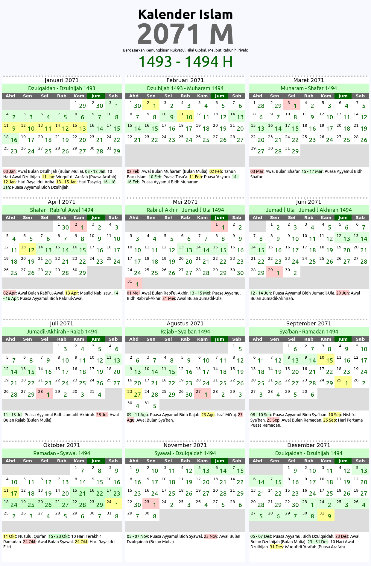 Kalender islam global tahun 2071 M ini berdasarkan kaidah imkan rukyat global di mana awal bulan hijriyah dihitung berdasarkan penampakan hilal di daratan mana saja di dunia ini. Kalender hijriyah 2071 M ini meliputi tahun islam: 1493, 1494 H. Tabel penanggalan atau tarikh islam yg ditampilkan ditandai dengan beberapa kode warna sesuai dengan jenis tanggalnya seperti: awal bulan hijriyah 2071 M, hari-hari besar umat islam 2071 M, serta tanggal puasa sunnah dan wajib tahun 2071 M.