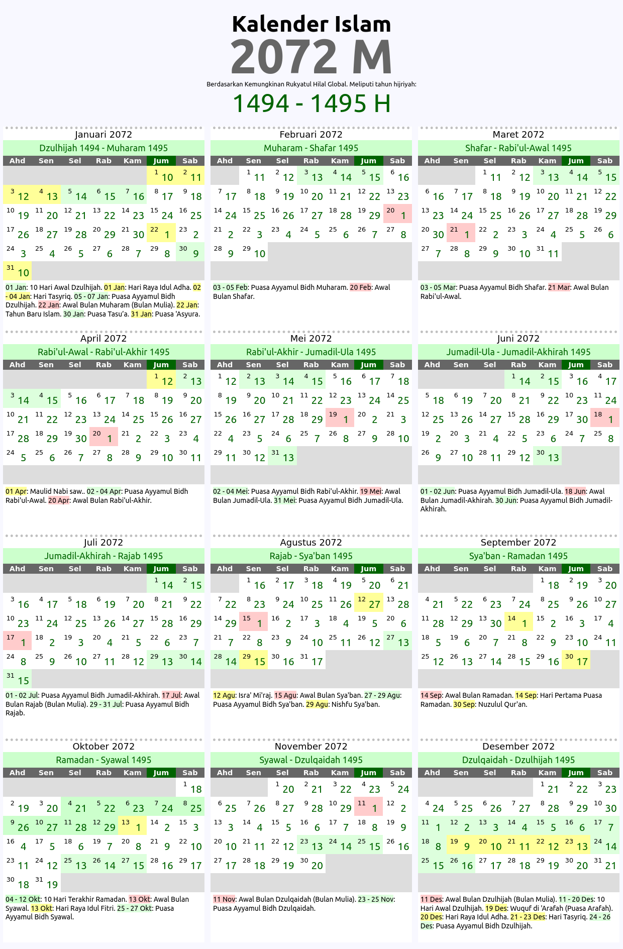 Kalender islam global tahun 2072 M ini berdasarkan kaidah imkan rukyat global di mana awal bulan hijriyah dihitung berdasarkan penampakan hilal di daratan mana saja di dunia ini. Kalender hijriyah 2072 M ini meliputi tahun islam: 1494, 1495 H. Tabel penanggalan atau tarikh islam yg ditampilkan ditandai dengan beberapa kode warna sesuai dengan jenis tanggalnya seperti: awal bulan hijriyah 2072 M, hari-hari besar umat islam 2072 M, serta tanggal puasa sunnah dan wajib tahun 2072 M.