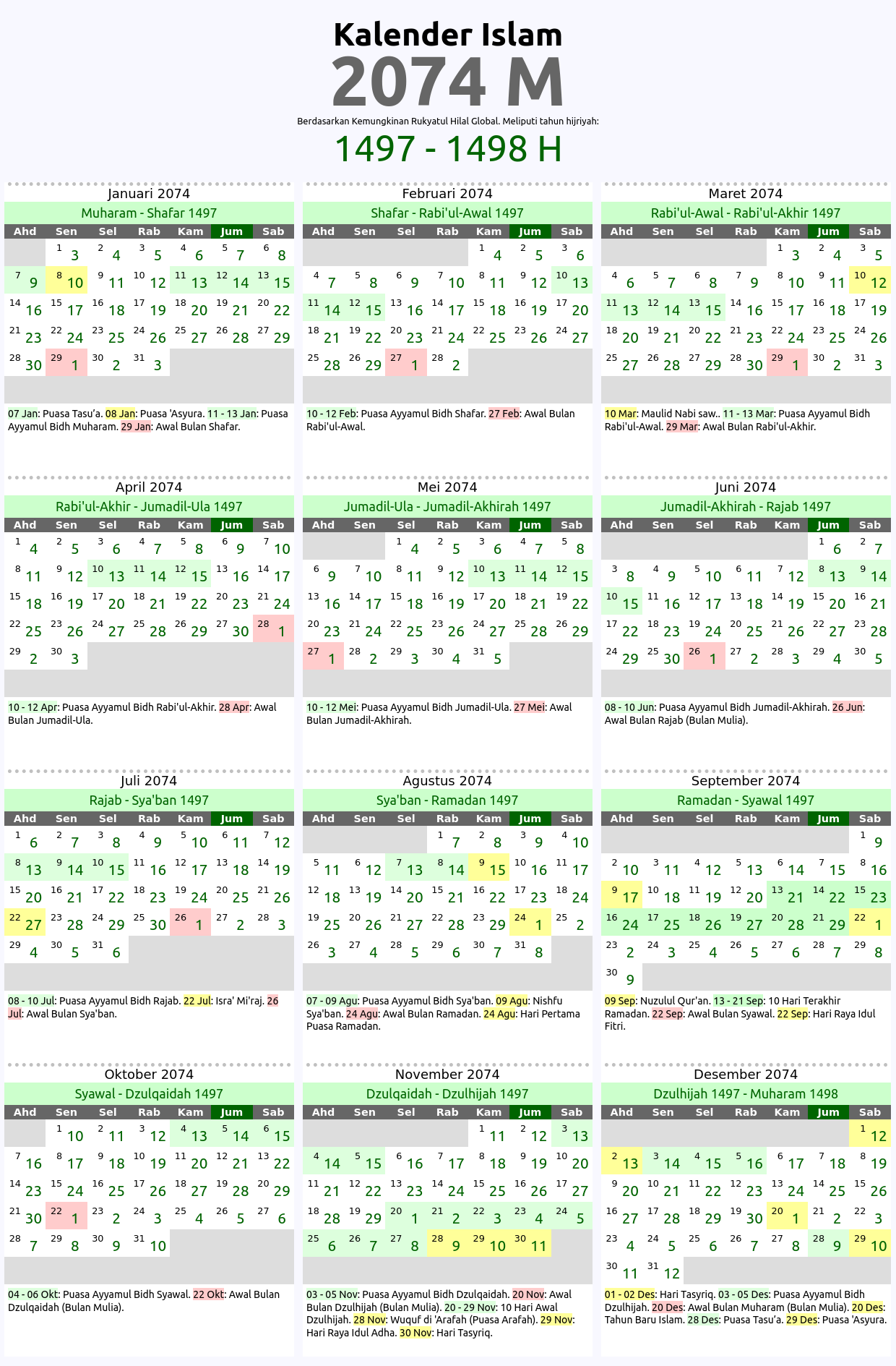 Kalender islam global tahun 2074 M ini berdasarkan kaidah imkan rukyat global di mana awal bulan hijriyah dihitung berdasarkan penampakan hilal di daratan mana saja di dunia ini. Kalender hijriyah 2074 M ini meliputi tahun islam: 1497, 1498 H. Tabel penanggalan atau tarikh islam yg ditampilkan ditandai dengan beberapa kode warna sesuai dengan jenis tanggalnya seperti: awal bulan hijriyah 2074 M, hari-hari besar umat islam 2074 M, serta tanggal puasa sunnah dan wajib tahun 2074 M.