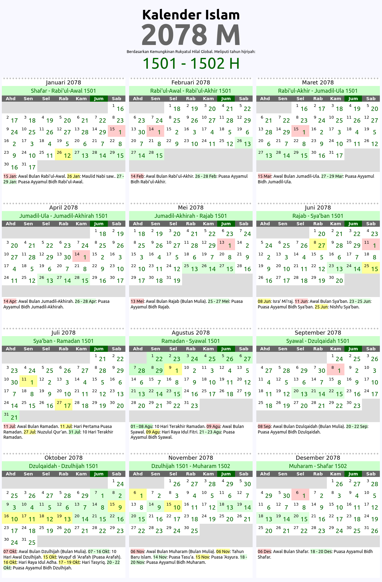 Kalender islam global tahun 2078 M ini berdasarkan kaidah imkan rukyat global di mana awal bulan hijriyah dihitung berdasarkan penampakan hilal di daratan mana saja di dunia ini. Kalender hijriyah 2078 M ini meliputi tahun islam: 1501, 1502 H. Tabel penanggalan atau tarikh islam yg ditampilkan ditandai dengan beberapa kode warna sesuai dengan jenis tanggalnya seperti: awal bulan hijriyah 2078 M, hari-hari besar umat islam 2078 M, serta tanggal puasa sunnah dan wajib tahun 2078 M.
