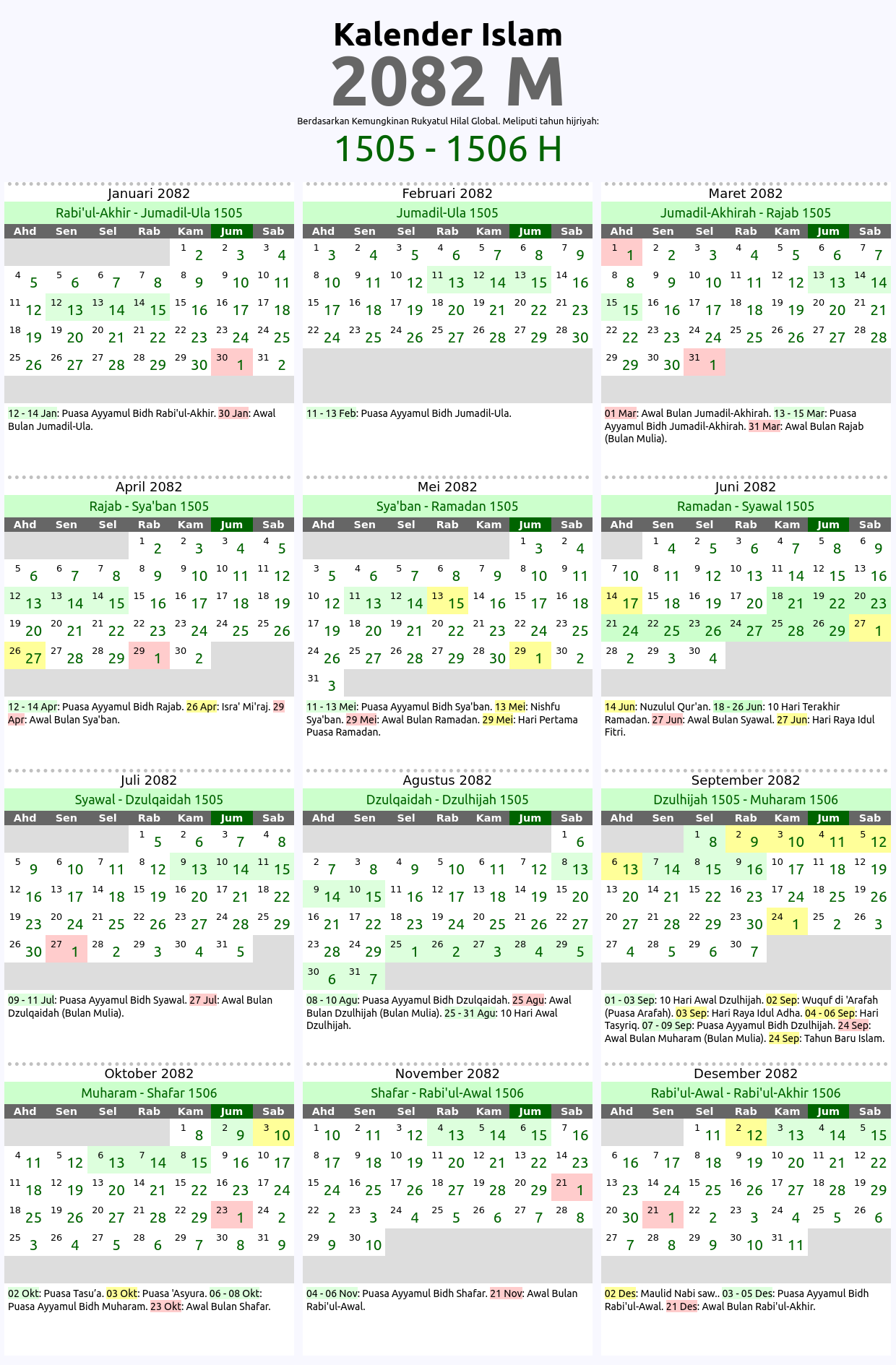 Kalender islam global tahun 2082 M ini berdasarkan kaidah imkan rukyat global di mana awal bulan hijriyah dihitung berdasarkan penampakan hilal di daratan mana saja di dunia ini. Kalender hijriyah 2082 M ini meliputi tahun islam: 1505, 1506 H. Tabel penanggalan atau tarikh islam yg ditampilkan ditandai dengan beberapa kode warna sesuai dengan jenis tanggalnya seperti: awal bulan hijriyah 2082 M, hari-hari besar umat islam 2082 M, serta tanggal puasa sunnah dan wajib tahun 2082 M.