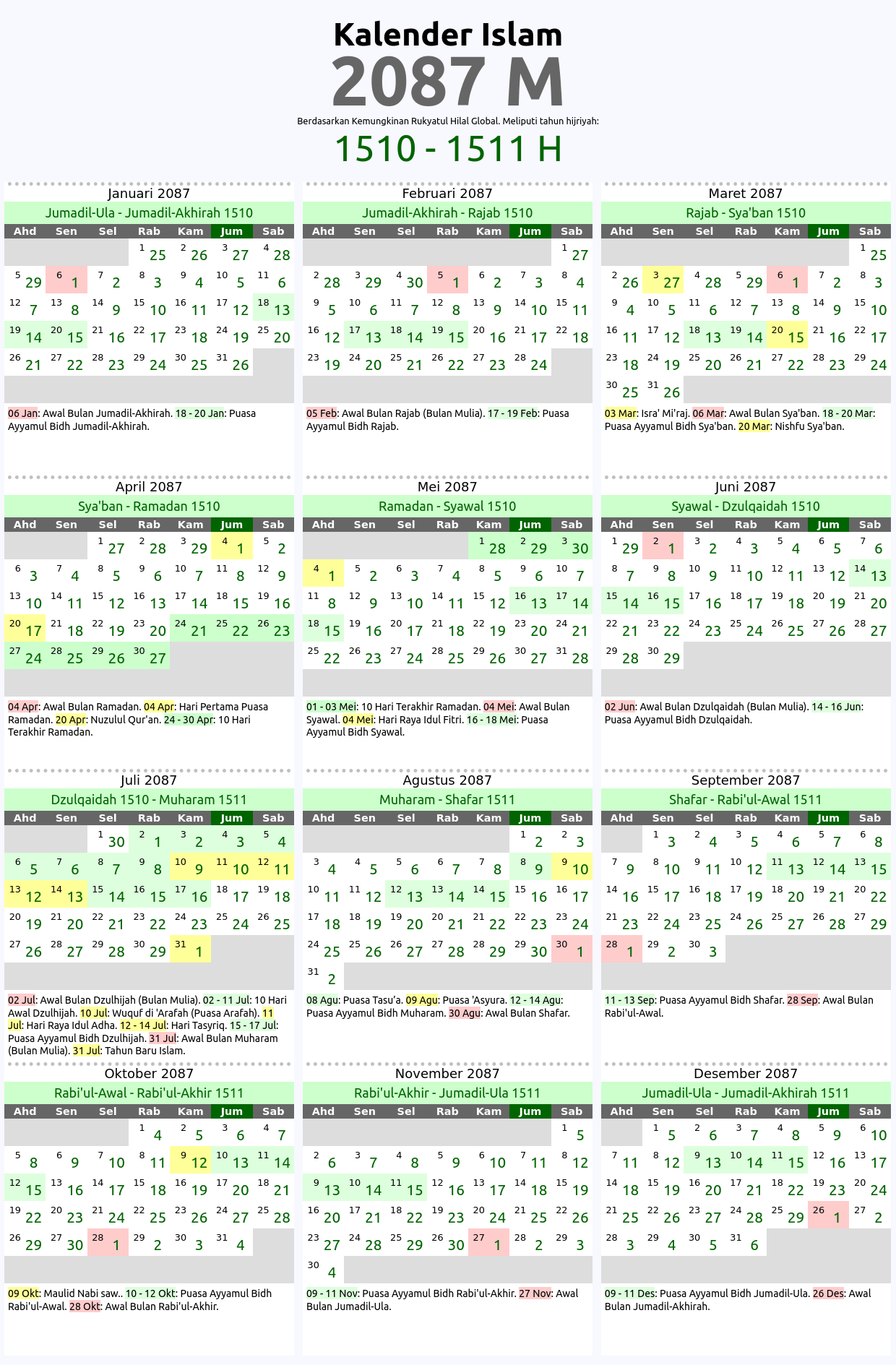 Kalender islam global tahun 2087 M ini berdasarkan kaidah imkan rukyat global di mana awal bulan hijriyah dihitung berdasarkan penampakan hilal di daratan mana saja di dunia ini. Kalender hijriyah 2087 M ini meliputi tahun islam: 1510, 1511 H. Tabel penanggalan atau tarikh islam yg ditampilkan ditandai dengan beberapa kode warna sesuai dengan jenis tanggalnya seperti: awal bulan hijriyah 2087 M, hari-hari besar umat islam 2087 M, serta tanggal puasa sunnah dan wajib tahun 2087 M.
