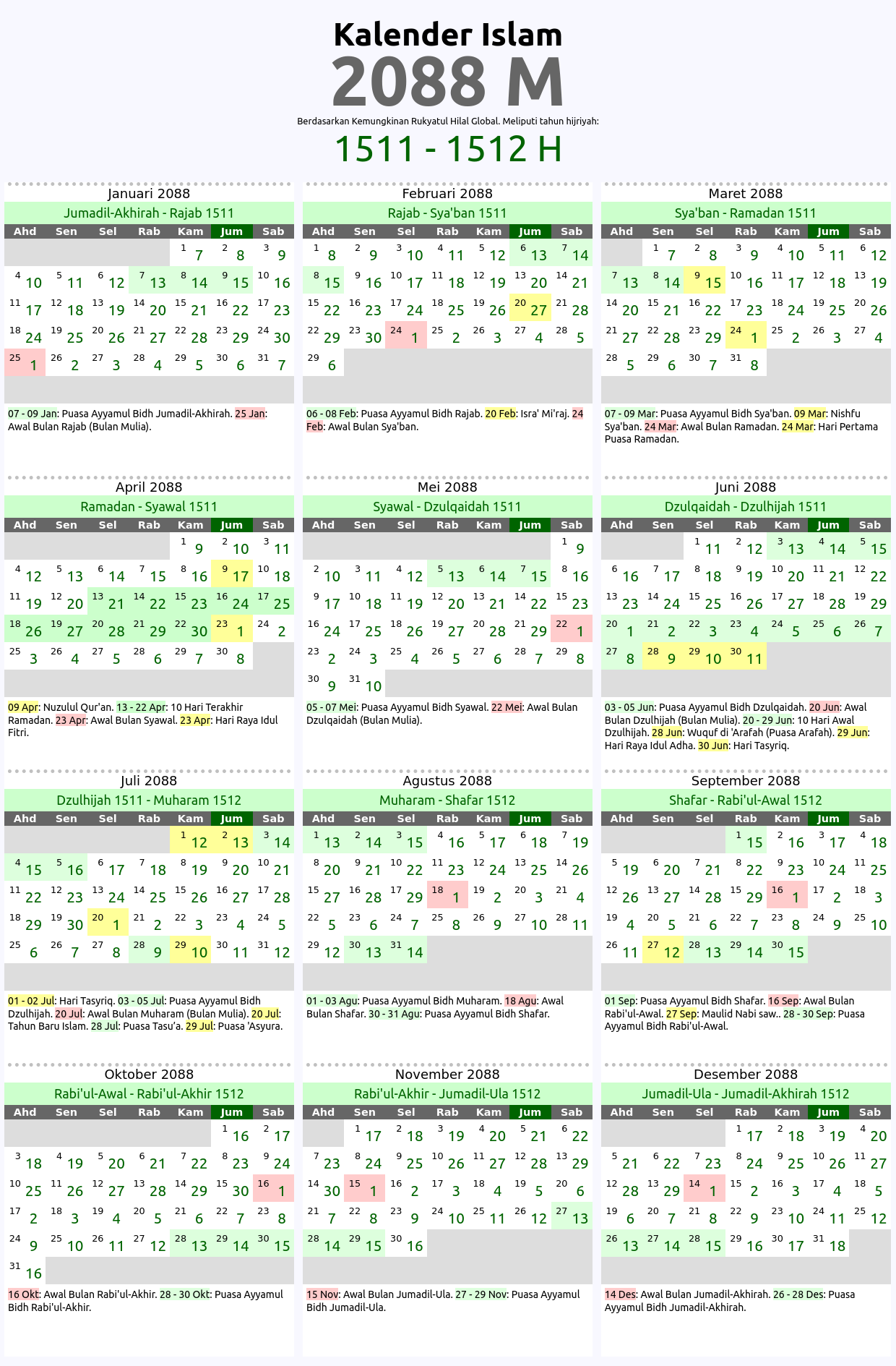 Kalender islam global tahun 2088 M ini berdasarkan kaidah imkan rukyat global di mana awal bulan hijriyah dihitung berdasarkan penampakan hilal di daratan mana saja di dunia ini. Kalender hijriyah 2088 M ini meliputi tahun islam: 1511, 1512 H. Tabel penanggalan atau tarikh islam yg ditampilkan ditandai dengan beberapa kode warna sesuai dengan jenis tanggalnya seperti: awal bulan hijriyah 2088 M, hari-hari besar umat islam 2088 M, serta tanggal puasa sunnah dan wajib tahun 2088 M.