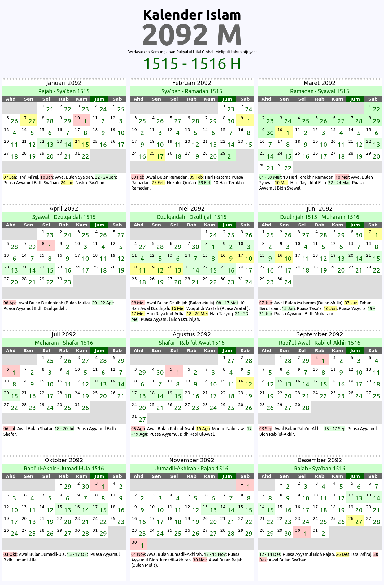 Kalender islam global tahun 2092 M ini berdasarkan kaidah imkan rukyat global di mana awal bulan hijriyah dihitung berdasarkan penampakan hilal di daratan mana saja di dunia ini. Kalender hijriyah 2092 M ini meliputi tahun islam: 1515, 1516 H. Tabel penanggalan atau tarikh islam yg ditampilkan ditandai dengan beberapa kode warna sesuai dengan jenis tanggalnya seperti: awal bulan hijriyah 2092 M, hari-hari besar umat islam 2092 M, serta tanggal puasa sunnah dan wajib tahun 2092 M.