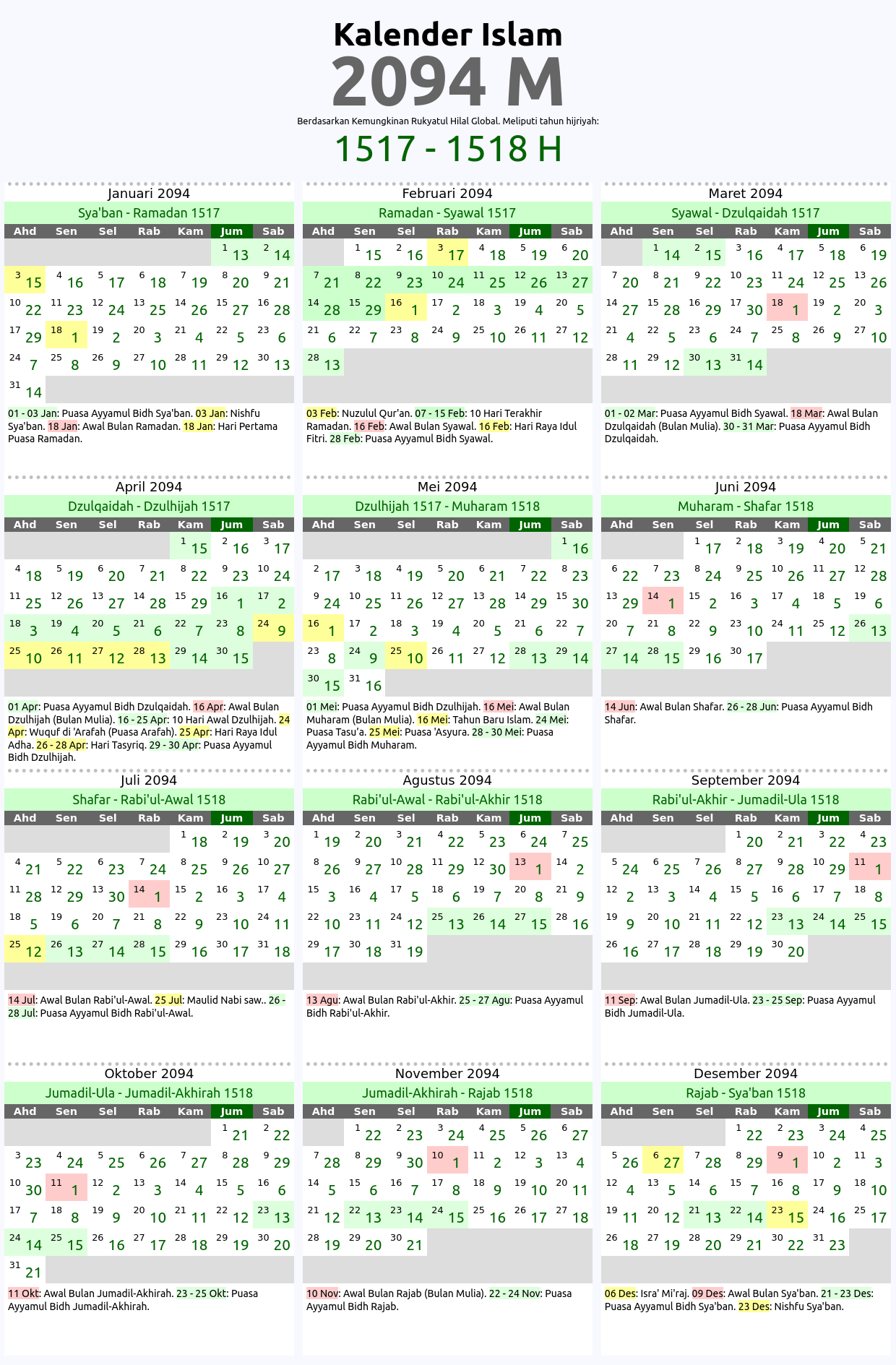 Kalender islam global tahun 2094 M ini berdasarkan kaidah imkan rukyat global di mana awal bulan hijriyah dihitung berdasarkan penampakan hilal di daratan mana saja di dunia ini. Kalender hijriyah 2094 M ini meliputi tahun islam: 1517, 1518 H. Tabel penanggalan atau tarikh islam yg ditampilkan ditandai dengan beberapa kode warna sesuai dengan jenis tanggalnya seperti: awal bulan hijriyah 2094 M, hari-hari besar umat islam 2094 M, serta tanggal puasa sunnah dan wajib tahun 2094 M.