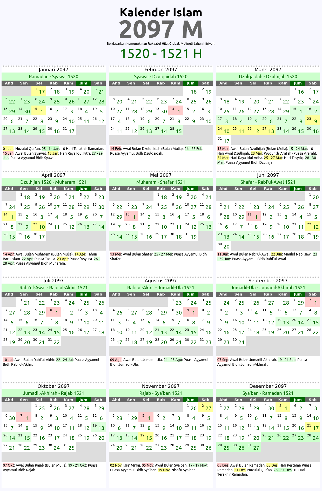 Kalender islam global tahun 2097 M ini berdasarkan kaidah imkan rukyat global di mana awal bulan hijriyah dihitung berdasarkan penampakan hilal di daratan mana saja di dunia ini. Kalender hijriyah 2097 M ini meliputi tahun islam: 1520, 1521 H. Tabel penanggalan atau tarikh islam yg ditampilkan ditandai dengan beberapa kode warna sesuai dengan jenis tanggalnya seperti: awal bulan hijriyah 2097 M, hari-hari besar umat islam 2097 M, serta tanggal puasa sunnah dan wajib tahun 2097 M.