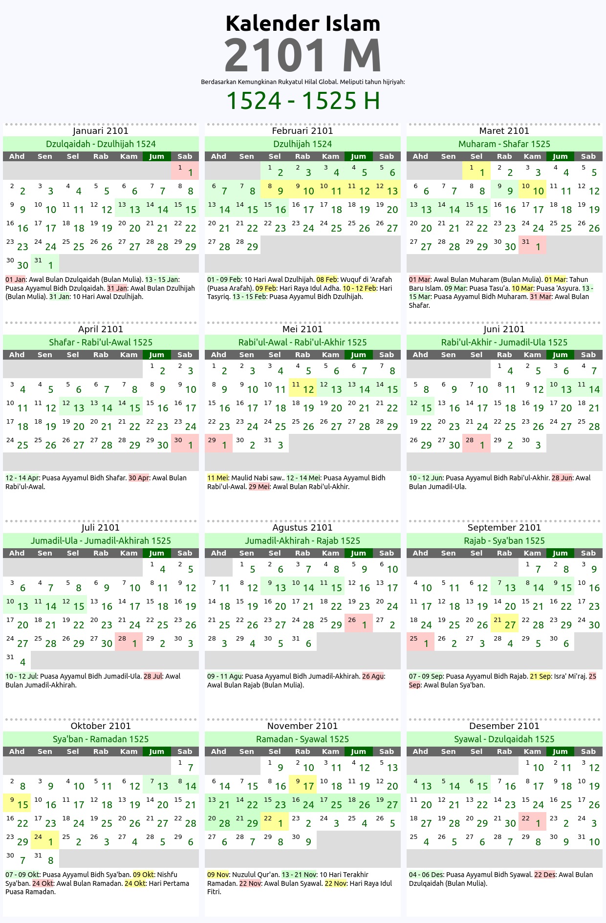 Kalender islam global tahun 2101 M ini berdasarkan kaidah imkan rukyat global di mana awal bulan hijriyah dihitung berdasarkan penampakan hilal di daratan mana saja di dunia ini. Kalender hijriyah 2101 M ini meliputi tahun islam: 1524, 1525 H. Tabel penanggalan atau tarikh islam yg ditampilkan ditandai dengan beberapa kode warna sesuai dengan jenis tanggalnya seperti: awal bulan hijriyah 2101 M, hari-hari besar umat islam 2101 M, serta tanggal puasa sunnah dan wajib tahun 2101 M.