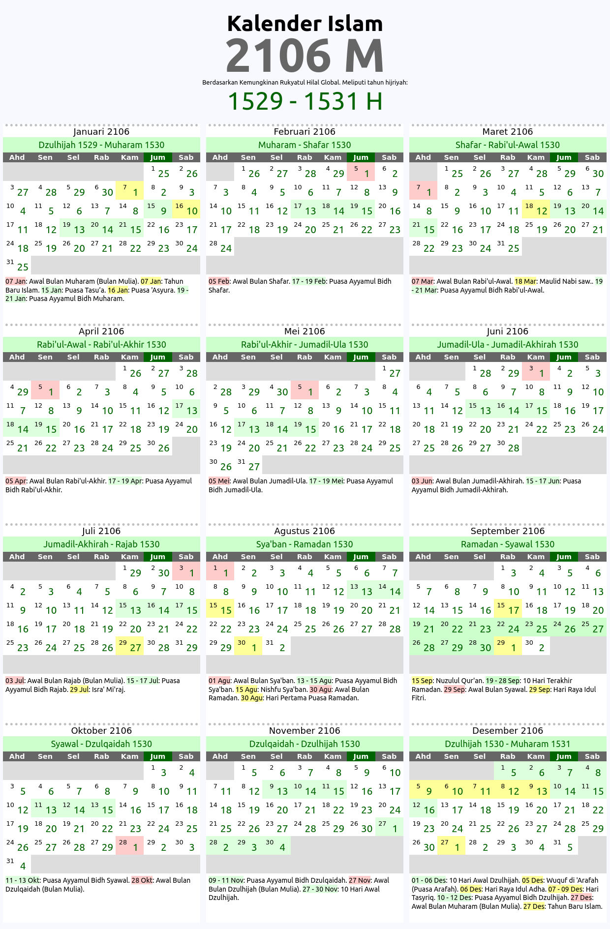Kalender islam global tahun 2106 M ini berdasarkan kaidah imkan rukyat global di mana awal bulan hijriyah dihitung berdasarkan penampakan hilal di daratan mana saja di dunia ini. Kalender hijriyah 2106 M ini meliputi tahun islam: 1529, 1531 H. Tabel penanggalan atau tarikh islam yg ditampilkan ditandai dengan beberapa kode warna sesuai dengan jenis tanggalnya seperti: awal bulan hijriyah 2106 M, hari-hari besar umat islam 2106 M, serta tanggal puasa sunnah dan wajib tahun 2106 M.