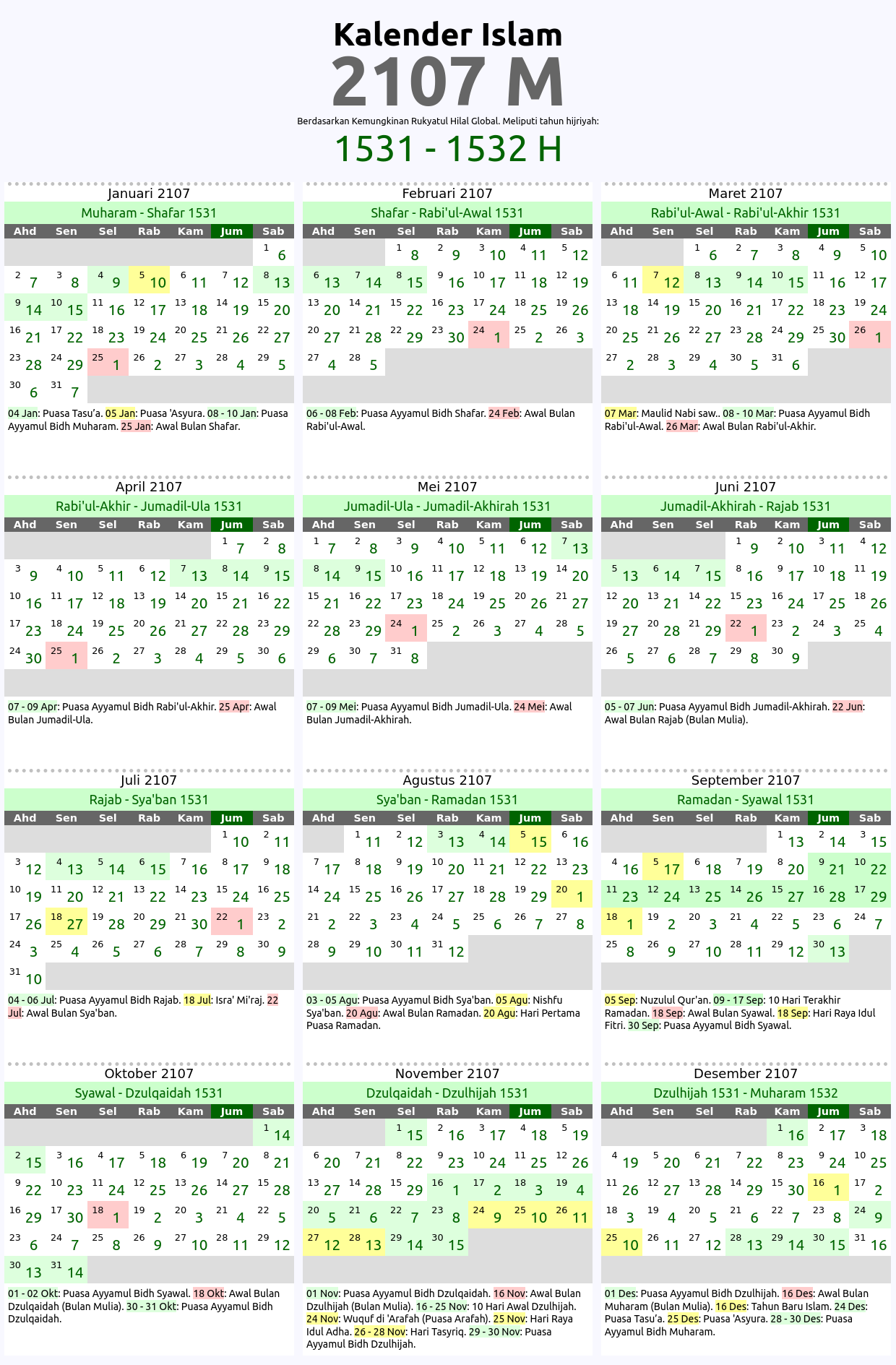 Kalender islam global tahun 2107 M ini berdasarkan kaidah imkan rukyat global di mana awal bulan hijriyah dihitung berdasarkan penampakan hilal di daratan mana saja di dunia ini. Kalender hijriyah 2107 M ini meliputi tahun islam: 1531, 1532 H. Tabel penanggalan atau tarikh islam yg ditampilkan ditandai dengan beberapa kode warna sesuai dengan jenis tanggalnya seperti: awal bulan hijriyah 2107 M, hari-hari besar umat islam 2107 M, serta tanggal puasa sunnah dan wajib tahun 2107 M.