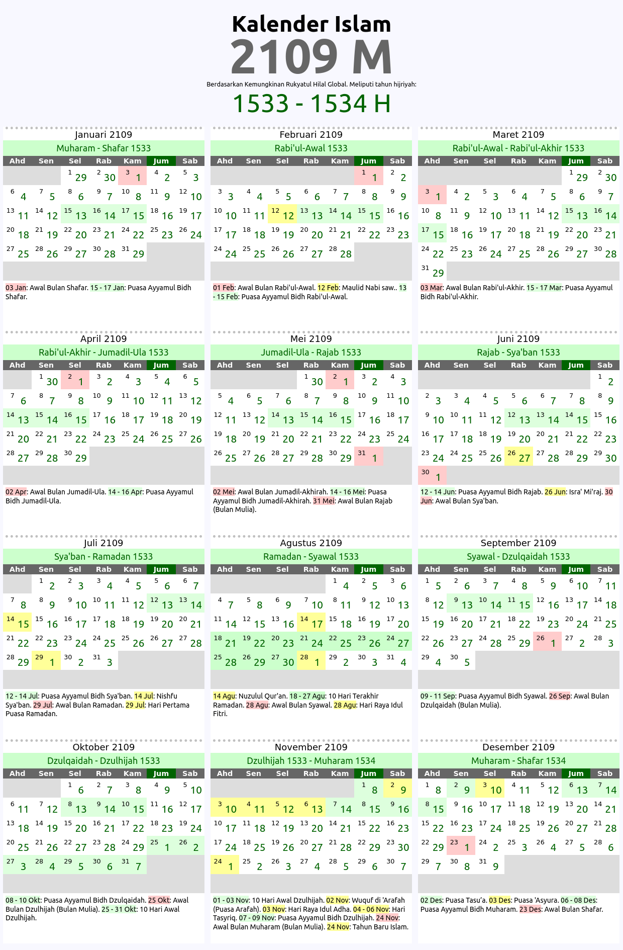 Kalender islam global tahun 2109 M ini berdasarkan kaidah imkan rukyat global di mana awal bulan hijriyah dihitung berdasarkan penampakan hilal di daratan mana saja di dunia ini. Kalender hijriyah 2109 M ini meliputi tahun islam: 1533, 1534 H. Tabel penanggalan atau tarikh islam yg ditampilkan ditandai dengan beberapa kode warna sesuai dengan jenis tanggalnya seperti: awal bulan hijriyah 2109 M, hari-hari besar umat islam 2109 M, serta tanggal puasa sunnah dan wajib tahun 2109 M.