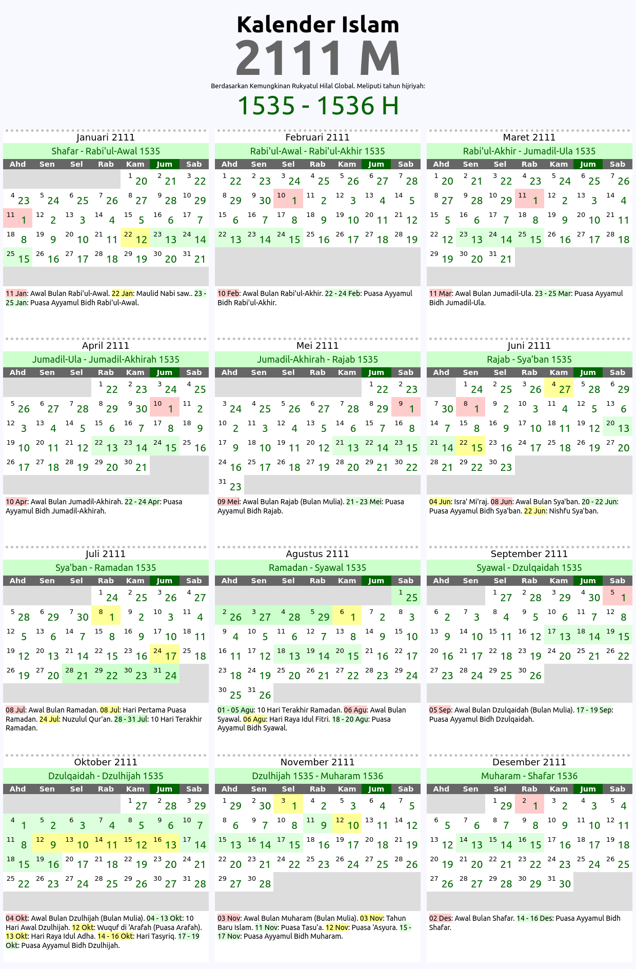 | 03 November 2111 | Awal Bulan Muharam (Bulan Mulia) 1536 H | 1 Muharam 1536 H | Selasa |
