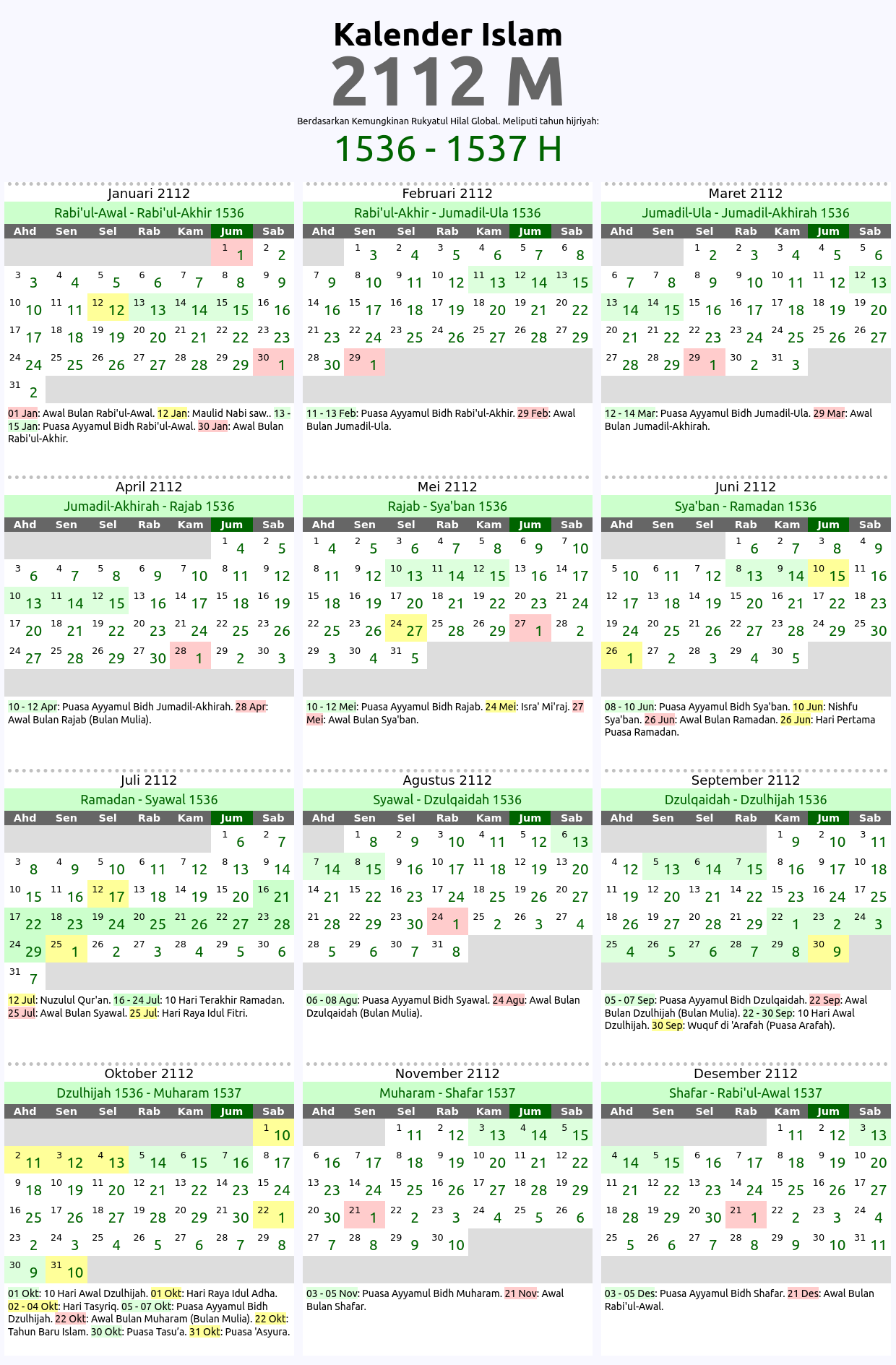 | 01 Januari 2112 | Awal Bulan Rabi'ul-Awal 1536 H | 1 Rabi'ul-Awal 1536 H | Jum'at |