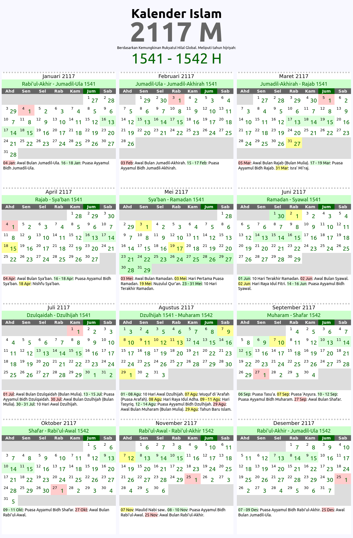 Kalender islam global tahun 2117 M ini berdasarkan kaidah imkan rukyat global di mana awal bulan hijriyah dihitung berdasarkan penampakan hilal di daratan mana saja di dunia ini. Kalender hijriyah 2117 M ini meliputi tahun islam: 1541, 1542 H. Tabel penanggalan atau tarikh islam yg ditampilkan ditandai dengan beberapa kode warna sesuai dengan jenis tanggalnya seperti: awal bulan hijriyah 2117 M, hari-hari besar umat islam 2117 M, serta tanggal puasa sunnah dan wajib tahun 2117 M.