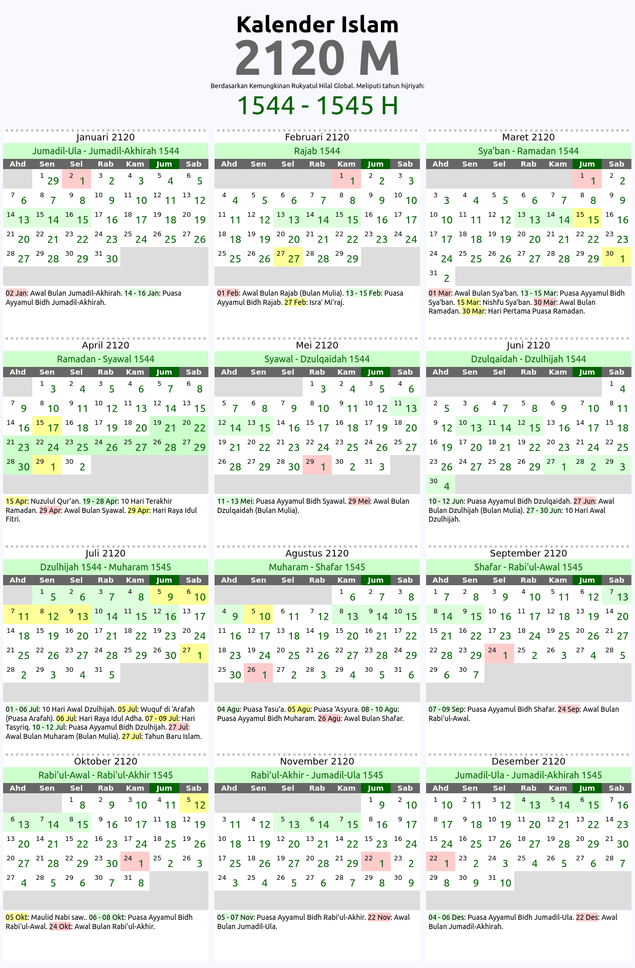 Kalender islam global tahun 2120 M ini berdasarkan kaidah imkan rukyat global di mana awal bulan hijriyah dihitung berdasarkan penampakan hilal di daratan mana saja di dunia ini. Kalender hijriyah 2120 M ini meliputi tahun islam: 1544, 1545 H. Tabel penanggalan atau tarikh islam yg ditampilkan ditandai dengan beberapa kode warna sesuai dengan jenis tanggalnya seperti: awal bulan hijriyah 2120 M, hari-hari besar umat islam 2120 M, serta tanggal puasa sunnah dan wajib tahun 2120 M.