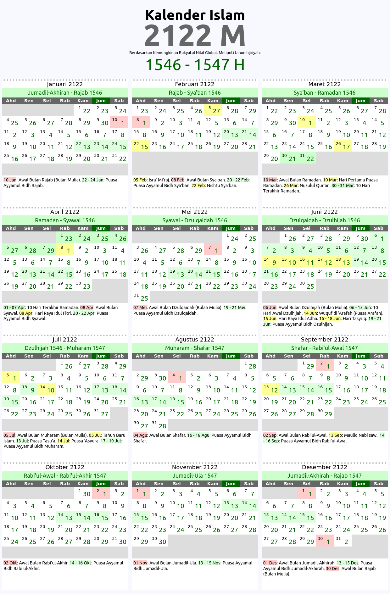 | 06 Juni 2122 | Awal Bulan Dzulhijah (Bulan Mulia) 1546 H | 1 Dzulhijah 1546 H | Sabtu |