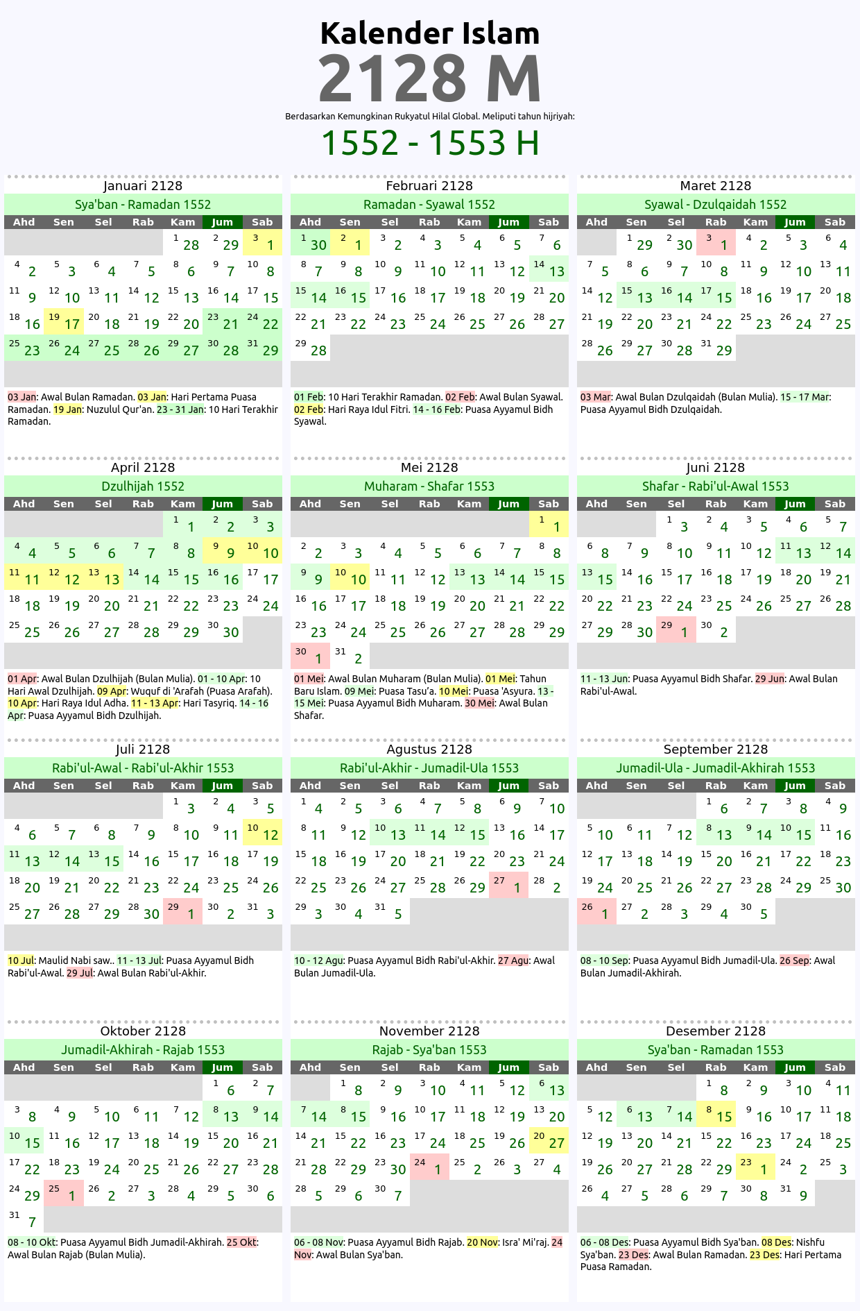 | 23 Desember 2128 | Awal Bulan Ramadan 1553 H | 1 Ramadan 1553 H | Kamis |